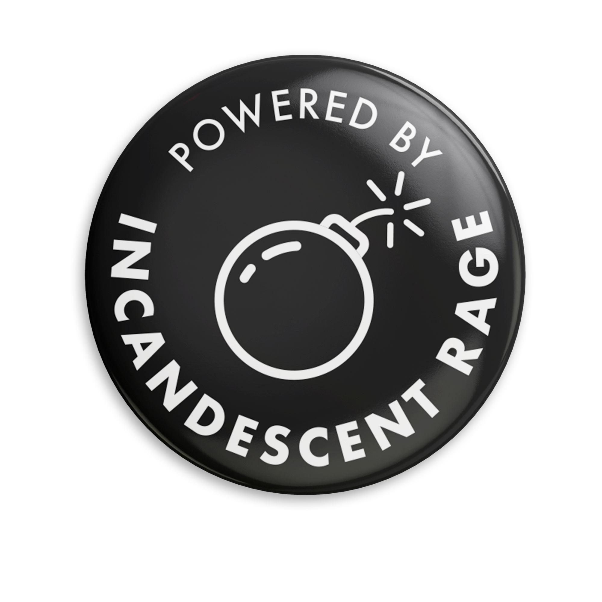 This 1.25" pinback button features the text "Powered by Incandescent Rage" and an old-timey bomb icon in white on a black background.